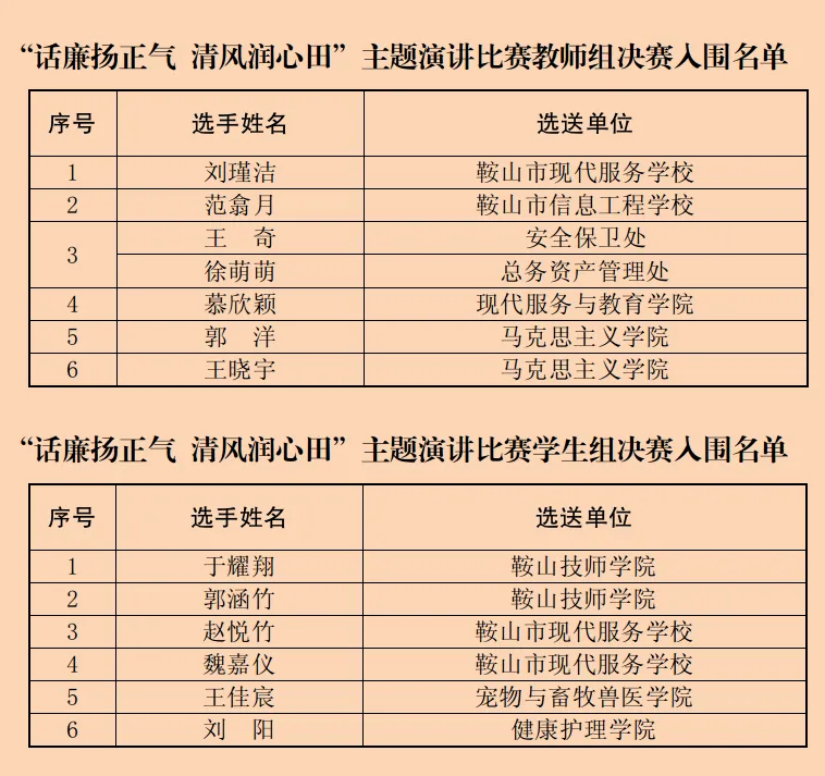 通知公告 通知公告 当前位置: 本站首页 >> 通知公告 >> 正文 名单公布!“话廉扬正气 清风润心田”主题演讲比赛复赛成绩揭晓! 发布日期:2025-10-24 点击: 名单公布!“话廉扬正气 清风润心田”主题演讲比赛复赛成绩揭晓!“话廉扬正气 清风润心田”主题演讲比赛复赛结果已出炉。比赛自启动以来,得到了直属各单位、机关各部门和各二级学院的大力支持以及师生们的积极响应,经过复赛的激烈角逐与现场评委严格评审,最终从48名选手中确定12组师生选手成功晋级决赛,现将决赛名单及相关安排予以公布。决赛时间:拟定2025年11月24日下午,如有特殊情况另行通知,请随时关注消息。决赛地点:图书馆3楼报告厅决赛名单:恭贺上述选手入围! 上一篇:鞍山市纪委监委通报5起违反中央八项规定精神典型案例
